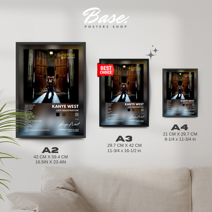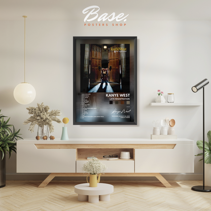 Feier die bahnbrechende Kunst von Kanye West mit diesem atemberaubenden Poster, das sein legendäres Album 'Late Registration' zeigt. Dieses Poster ist nicht nur Deko; es ist eine Hommage an ein Album, das Hip-Hop und Kultur neu definiert hat.