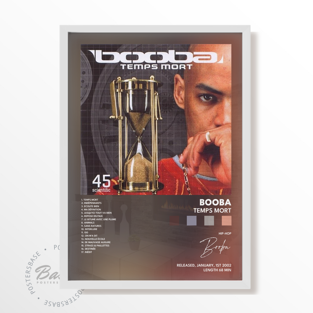 Eleva tu espacio con el impactante poster Booba - Temps Mort, un must para fans del hip-hop contemporáneo y amantes del arte por igual. Este Póster no solo muestra la imagen icónica de Booba, sino que también captura la esencia de su álbum revolucionario, "Temps Mort".